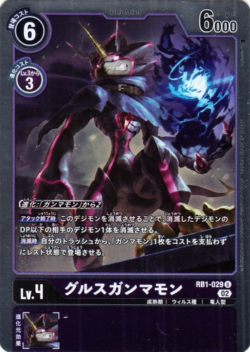 ![]() ![]() | RB1-029 グルスガンマモン デジモン リブートブースター ライジングウインド U(foil) 色:紫 レベル:4 登場コスト:6 進化コスト1:紫Lv.3から3 DP:6000 形態:成熟期 属性:ウィルス種 タイプ:竜人型 ブロック:02 【進化:「ガンマモン」から2】 【アタック終了時】このデジモンを消滅させることで、消滅したデジモンのDP以下の相手のデジモン1体を消滅させる。 【消滅時】自分のトラッシュから「ガンマモン」1枚をコストを支払わずにレスト状態で登場させる。 イラストレーター:toriyufu |