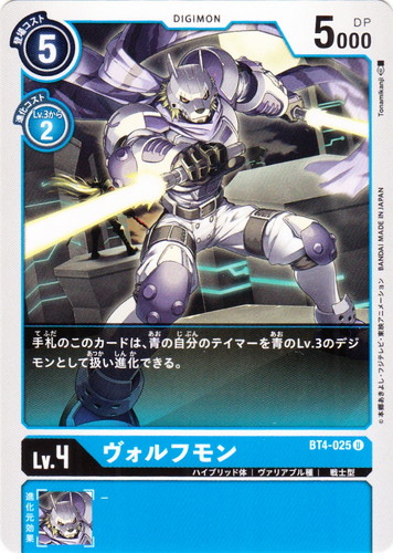 ![]() ![]() | BT4-025 ヴォルフモン デジモン ブースターパック グレイトレジェンド U 色:青 レベル:4 登場コスト:5 進化コスト1:青Lv.3から2 DP:5000 形態:ハイブリッド体 属性:ヴァリアブル種 タイプ:戦士型 手札のこのカードは、青の自分のテイマーを青のLv.3のデジモンとして扱い進化できる。 イラストレーター:Tonamikanji |