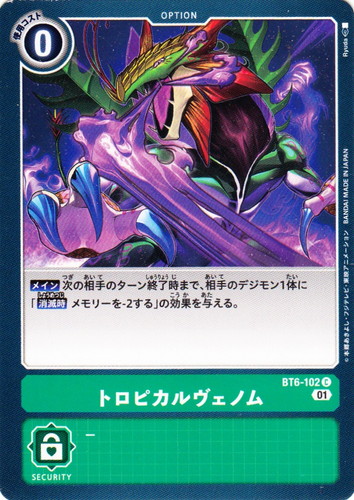![]() ![]() | BT6-102 トロピカルヴェノム オプション ブースターパック ダブルダイヤモンド C 色:緑 登場コスト:0 ブロック:01 【メイン】次の相手のターン終了時まで、相手のデジモン1体に「【消滅時】メモリーを-2する」の効果を与える。 イラストレーター:Ryuda |