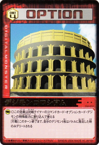 ![]() ![]() | Oα-012 デジモンコロシアム オプション Evolve.2 R コスト:4 星:2 ◎この効果は対戦テイマーのコマンドカード・オプションカード・デジモンの特殊能力に割り込んで使える [行動]このターン終了まで、自分のデジモン1枚はバトルに敗北した時のみデリートされる |