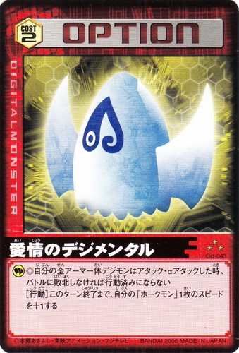 ![]() ![]() | Oα-043 愛情のデジメンタル オプション Evolve.4 C コスト:2 星:3 ◎自分の全アーマー体デジモンはアタック・αアタックした時、バトルに敗北しなければ行動済みにならない [行動]このターン終了まで、自分の「ホークモン」1枚のスピードを+1する |