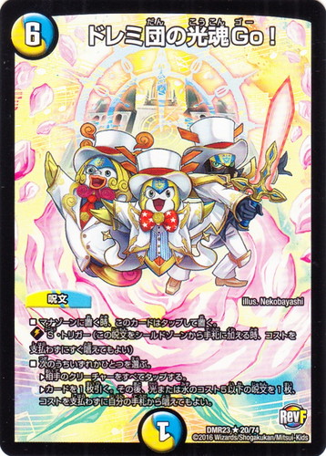 ![]() ![]() | DMR23 19 ミラクル1 ドレミ24 クリーチャー 革命ファイナル 最終章 ドギラゴールデンvsドルマゲドンX R 文明:光/水 コスト:5 マナ:1 パワー:4000 種族:エンジェル・ドラゴン/革命軍/ドレミ団 ■マナゾーンに置く時、このカードはタップして置く。 ■革命チェンジ:光または水のクリーチャー(自分の光または水のクリーチャーが攻撃する時、そのクリーチャーと手札にあるこのクリーチャーを入れ替えてもよい) ■このクリーチャーがバトルゾーンに出た時、光または水のコスト3以下の呪文を1枚、コストを支払わずに自分の手札から唱えてもよい。 illus:Nekobayashi |