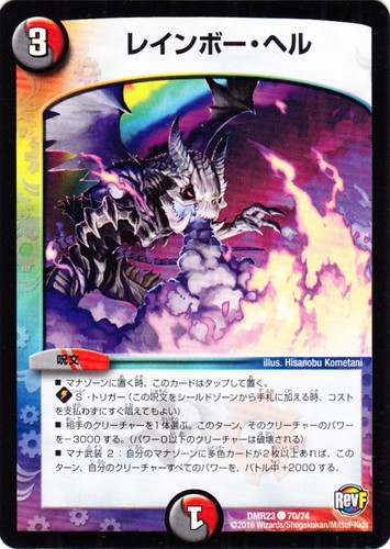 ![]() ![]() | DMR23 70 レインボー・ヘル 呪文 革命ファイナル 最終章 ドギラゴールデンvsドルマゲドンX C 文明:闇/火 コスト:3 マナ:1 ■マナゾーンに置く時、このカードはタップして置く。 ◆S・トリガー(この呪文をシールドゾーンから手札に加える時、コストを支払わずにすぐ唱えてもよい) ■相手のクリーチャーを1体選ぶ。このターン、そのクリーチャーのパワーを-3000する。(パワー0以下のクリーチャーは破壊される) ■マナ武装2:自分のマナゾーンに多色カードが2枚以上あれば、このターン、自分のクリーチャーすべてのパワーを、バトル中+2000する。 illus:Hisanobu Kometani |