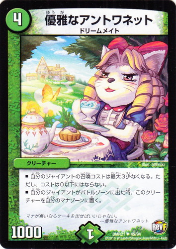 ![]() ![]() | DMR21 45 優雅なアントワネット クリーチャー 革命ファイナル 第1章 ハムカツ団とドギラゴン剣 U 文明:自然 コスト:4 マナ:1 パワー:1000 種族:ドリームメイト ■自分のジャイアントの召喚コストは最大3少なくなる。ただし、コストは0以下にはならない。 ■自分のジャイアントがバトルゾーンに出た時、このクリーチャーを自分のマナゾーンに置く。 マナが無いならケーキを出せばいいじゃない。 ---優雅なアントワネット illus:500siki |