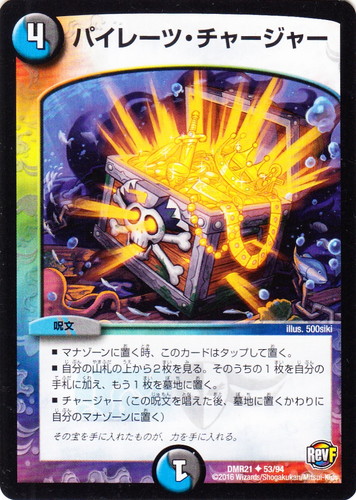 ![]() ![]() | DMR21 53 パイレーツ・チャージャー 呪文 革命ファイナル 第1章 ハムカツ団とドギラゴン剣 U 文明:闇/水 コスト:4 マナ:1 ■マナゾーンに置く時、このカードはタップして置く。 ■自分の山札の上から2枚を見る。そのうちの1枚を自分の手札に加え、もう1枚を墓地に置く。 ■チャージャー(この呪文を唱えた後、墓地に置くかわりに自分のマナゾーンに置く) その宝を手に入れたものが、力を手に入れる。 illus:500siki |