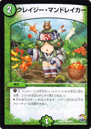 ![]() ![]() | DMR21 84 クレイジー・マンドレイカー 呪文 革命ファイナル 第1章 ハムカツ団とドギラゴン剣 C 文明:自然 コスト:2 マナ:1 ◆S・トリガー(この呪文をシールドゾーンから手札に加える時、コストを支払わずにすぐ唱えてもよい) ■次の自分のターンのはじめまで、パワー3000以下のクリーチャーは攻撃できない。 illus:YOICHI ITO |