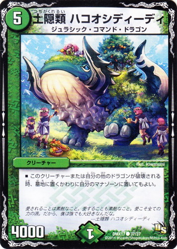 ![]() ![]() | DMX17 37 土隠類 ハコオシディーディ クリーチャー 龍の祭典!ドラゴン魂フェス!! C 文明:自然 コスト:5 マナ:1 パワー:4000 種族:ジュラシック・コマンド・ドラゴン ■このクリーチャーまたは自分の他のドラゴンが破壊されている時、墓地に置くかわりに自分のマナゾーンに置いてもよい。 愛されることは素敵なこと。愛することは素敵なこと。愛こそ全ての力の源。だから、僕は誰でも大好きなんだな。 ---土隠類 ハコオシディーディ illus:kawasumi |
