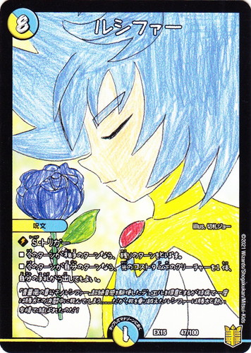 ![]() ![]() | EX15 47 ルシファー 呪文 20周年超感謝パック 魂の章 名場面BEST 文明:光/水 コスト:8 マナ:1 タップしてマナゾーンにおく ◆S・トリガー ■今のターンが相手のターンなら、残りのターンを飛ばす。 ■今のターンが自分のターンなら、光のコスト9以下のクリーチャーを1体、自分の手札から出してもよい。 「青薔薇の貴公子」ルシファー。超絶音感を駆使したデュエルを得意とするが持病で一度は勝太との決闘中に死んでしまう・・・・・・だが、死を乗り越えたルシファーは勝太と熱い友情で結ばれたのだ! illus:切札ジョー |