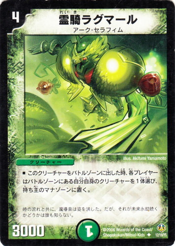 ![]() ![]() | DMC29 12 霊騎ラグマール クリーチャー アーク・セラフィム・リバーサー1/2 U 文明:自然 コスト:4 マナ:1 パワー:3000 種族:アーク・セラフィム ■このクリーチャーをバトルゾーンに出した時、各プレイヤーはバトルゾーンにある自分自身のクリーチャーを1体選び、持ち主のマナゾーンに置く。 時の流れと共に、魔導具は姿を消した。だが、それが未来永劫続くかどうかは誰も知らない。 illus:Akifumi Yamamoto |