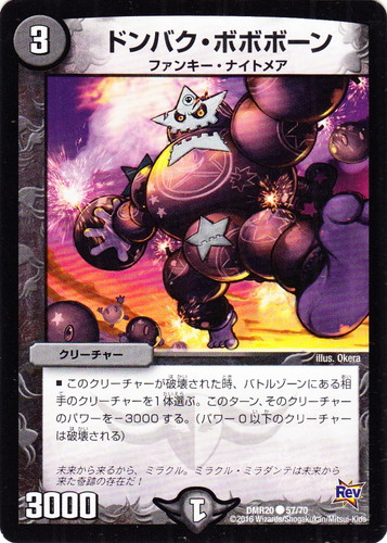 ![]() ![]() | DMR20 57 ドンバク・ボボボーン クリーチャー 革命編 第4章 正体判明のギュウジン丸!! C 文明:闇 コスト:3 マナ:1 パワー:3000 種族:ファンキー・ナイトメア ■このクリーチャーが破壊された時、バトルゾーンにある相手のクリーチャーを1体選ぶ。そのターン、そのクリーチャーのパワーを-3000する。(パワー0以下のクリーチャーは破壊される) 未来から来るからミラクル。ミラクル・ミラダンテは未来から来た奇跡の存在だ! illus:Okera |