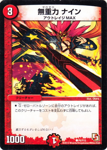 ![]() ![]() | P5/Y12 無重力 ナイン クリーチャー プロモ限定カード12期 C 文明:火 コスト:3 マナ:1 パワー:1000 種族:アウトレイジMAX ■G・ゼロ-バトルゾーンに自分のアウトレイジがあれば、このクリーチャーをコストを支払わずに召喚してもよい。 重力すらもオレをしばれない! illus:Okera |