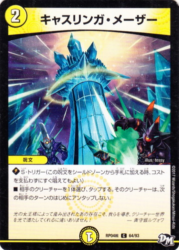![]() ![]() | RP04裁 64 キャスリンガ・メーザー 呪文 新4弾 誕ジョー!マスタードラゴン!!~正義ノ裁キ~ C 文明:光 コスト:2 マナ:1 ◆S・トリガー(この呪文をシールドゾーンから手札に加える時、コストを支払わずにすぐ唱えてもよい) ■相手のクリーチャーを1体選び、タップする。そのクリーチャーは、次の相手のターンのはじめにアンタップしない。 光の女王様によって産み出されたあの存在こそ、我らを導き、クリーチャー世界を光で満たしてくれるに違いありません! ―青守銀ルヴォワ illus:tessy |