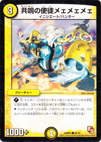 ![]() ![]() | DMR04 36 共鳴の使徒メェメェメェ クリーチャー エピソード1 ライジング・ホープ C 文明:光 コスト:3 マナ:1 パワー:1000+ 種族:イニシエート/ハンター ◆S・トリガー(このクリーチャーをシールドゾーンから手札に加える時、コストを支払わずにすぐ召喚してもよい) ■ハンティング(バトル中、このクリーチャーのパワーは、バトルゾーンにある自分のハンター1体につき+1000される) illus:sarmat |