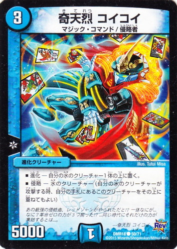 ![]() ![]() | DMR18 50 奇天烈 コイコイ 進化クリーチャー 革命編 第2章 時よ止まれミラダンテ!! C 文明:水 コスト:3 マナ:1 パワー:5000 種族:マジック・コマンド/侵略者 ■進化-自分の水のクリーチャー1体の上に置く。 ■侵略-水のクリーチャー(自分の水のクリーチャーが攻撃する時、自分の手札にあるこのクリーチャーをその上に重ねてもよい) あの最強の侵略者、レッドゾーンがやられただと!?一体なにが・・・ なに?革命ゼロの力が3つ揃った!?・・・同じ時代にそれだけの力が集結sるうとは・・・。 illus:Tutui Misa |