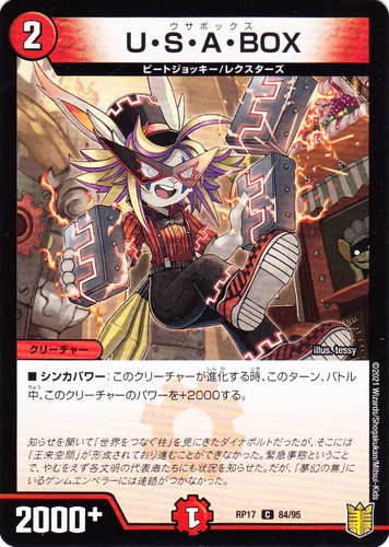 ![]() ![]() | RP17 84 U・S・A・BOX クリーチャー 王来篇 第1弾 王星伝説超動 C 文明:火 コスト:2 マナ:1 パワー:2000+ 種族:ビートジョッキー/レクスターズ ■シンカパワー:このクリーチャーが進化する時、このターン、バトル中、このクリーチャーのパワーを+2000する。 知らせを聞いて「世界をつなぐ柱」見にきたダイナボルトだったが、そこには「王来空間」が形成されており進むことができなかった。緊急事態ということで、やむをえず各文明の代表者たちに状況を知らせた。だが、「夢幻の無」にいるゲンムエンペラーには連絡がつかなかった。 illus:tessy |