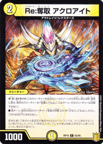![]() ![]() | RP19 62 Re:奪取 アクロアイト クリーチャー 王来篇 第3弾 禁断龍VS禁断竜 C 文明:光 コスト:2 マナ:1 パワー:1000 種族:アウトレイジ/レクスターズ ■G・ストライク(このクリーチャーを自分のシールドゾーンから手札に加える時、相手に見せ、相手のクリーチャーを1体選んでもよい。このターン、そのクリーチャーは攻撃できない) ■各ターン、自分の光のクリーチャー1体目の召喚コストを1少なくしてもよい。ただし、コストは0以下にはならない。 聖剣を通じて体内から聖闘気を爆発させられたドキダンテは、ついに再生することなく再び石化した。かくして「禁断王」ドキンダムXの魂は超獣王来烈伝へと還ったのだった。残る王の魂は5つ。 illus:kawaryu |