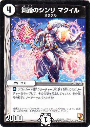 ![]() ![]() | DMD10 2 舞踏のシンリ マクイル クリーチャー 1stデッキ オラクル・ダッシュ 文明:無色 コスト:4 マナ:1 パワー:2000 種族:オラクル ■ブロッカー(相手クリーチャーが攻撃する時、このクリーチャーをタップして、その攻撃を阻止してもよい。その後、その相手クリーチャーとバトルする) 鬼羅丸とシャングリラの戦いによってゼニスが消滅して1万年。世界は「神の使徒」を名乗るオラクルたちが支配していた。 illus:boyaking |
