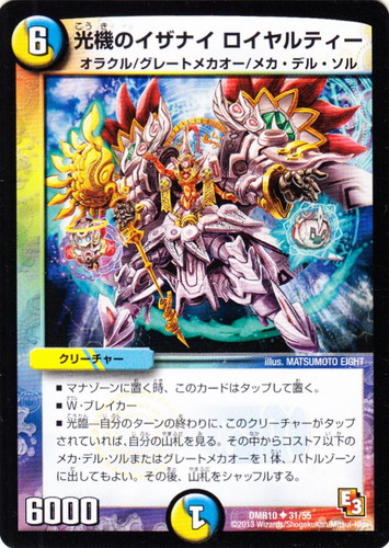 ![]() ![]() | DMR10 31 光機のイザナイ ロイヤルティー クリーチャー エピソード3 デッド&ビート U 文明:光/水 コスト:6 マナ:1 パワー:6000 種族:オラクル/グレートメカオー/メカ・デル・ソル ■マナゾーンに置く時、このカードはタップして置く。 ■W・ブレイカー ■光臨-自分のターンの終わりに、このクリーチャーがタップされていれば、自分の山札を見る。その中からコスト7以下のメカ・デル・ソルまたはグレートメカオーを1体、バトルゾーンに出してもよい。その後、山札をシャッフルする。 illus:MATSUMOTO EIGHT |