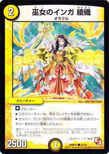 ![]() ![]() | DMR11 35 巫女のインガ 綾織 クリーチャー エピソード3 ウルトラVマスター C 文明:光 コスト:2 マナ:1 パワー:2500 種族:オラクル ■ブロッカー ■このクリーチャーは、相手プレイヤーを攻撃できない。 ■セイバー:ゴッド(自分のゴッドが破壊される時、このクリーチャーをかわりに破壊してもよい) 真のゴッド・ノヴァ、それはオラクルジュエルに封印されています。でも、それを復活させることができるのは、聖と邪、ふたつの心を併せ持った方のみ。 ---巫女のインガ 綾織 illus:HIRO “WO” NORI |