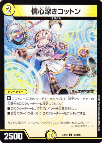 ![]() ![]() | EX12 83 信心深きコットン クリーチャー 最強戦略!! ドラリンパック C 文明:光 コスト:2 マナ:1 パワー:2500 種族:オラクル ■ブロッカー(このクリーチャーをタップして、相手クリーチャーの攻撃先をこのクリーチャーに変更してもよい) ■このクリーチャーは、相手プレイヤーを攻撃できない。 ■自分のターンの終わりに、このクリーチャーをアンタップする。 私たちの信仰が、ついにドラゴンのオラクリオン様を降臨させたのだわ・・・・・・ ―信心深きコットン illus:HIRO“WO”NORI |