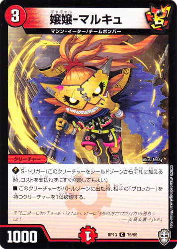 ![]() ![]() | RP13 75 嬢嬢-マルキュ クリーチャー 十王篇 第1弾 切札×鬼札 キングウォーズ!!! C 文明:火 コスト:3 マナ:1 パワー:1000 種族:マシン・イーター/チームボンバー ◆S・トリガー(このクリーチャーをシールドゾーンから手札に加える時、コストを支払わずにすぐ召喚してもよい) ■このクリーチャーがバトルゾーンに出た時、相手の「ブロッカー」を持つクリーチャーを1体破壊する。 〒″モ二才ー⊂カゝ于ョ─ぁ丶)ぇナょレヽ、レナー⊂″ぅちの方カゞカワィィカゝら勝ちっιょ! ―女襄女襄-マ」レ≠ュ illus:tessy |