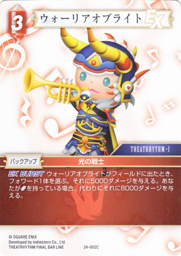 ![]() ![]() | 24-002C ウォーリアオブライト バックアップ 秘められた伝説 ブースターパック C 属性:火 ジョブ:光の戦士 CP:3 カテゴリ:THEATRHYTHM・I EXバースト ウォーリアオブライトがフィールドに出たとき、フォワード1体を選ぶ。それに5000ダメージを与える。あなたが[光]を持っている場合、代わりにそれに8000ダメージを与える。 出典:THEATRHYTHM FINAL BAR LINE |