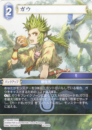 ![]() ![]() | 24-092R ガウ バックアップ 秘められた伝説 ブースターパック R 属性:水 ジョブ:野性児 CP:2 カテゴリ:VI あなたがモンスターを3体以上コントロールしている場合、ガウをキャストするためのコストは2減る。 [X][ダル]、ガウをブレイクゾーンに置く:コストXの【カード名(ガウ)】を最大1枚までと、コストXのモンスターを最大1枚までサーチし、【カード名(ガウ)】をフィールドに出し、モンスターを手札に加える。 出典:FINAL FANTASY VI |