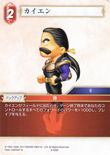 ![]() ![]() | 9-008C カイエン バックアップ Opus IX ブースターパック C 属性:火 ジョブ:侍 CP:2 カテゴリ:VI カイエンがフィールドに出たとき、ターン終了時まであなたのコントロールするすべてのフォワードのパワーを+1000し、ブレイブを与える。 出典:FINAL FANTASY VI |