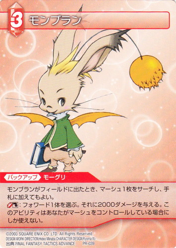![]() ![]() | PR-039 モンブラン バックアップ プロモーションカード(Chapter) 属性:火 ジョブ:モーグリ CP:3 モンブランがフィールドに出たとき、マーシュ1枚をサーチし、手札に加えてもよい。 [火1][ダル]:フォワード1体を選ぶ。それに2000ダメージを与える。このアビリティはあなたがマーシュをコントロールしている場合にしか使えない。 出典:FINAL FANTASY TACTICS ADVANCE |