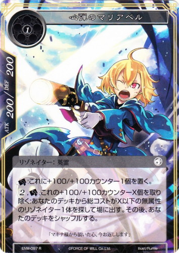 ![]() ![]() | ENW-097 心弾のマリアベル リゾネイター ラピスクラスタ 第4弾 ブースターパック 新世界童話 リ・アース R(foil) 属性:無 タイプ:英霊 コスト:(1) ATK:200 DEF:200 [レスト]:これに+100/+100カウンター1個を置く。 (2),[レスト],これの+100/+100カウンターX個を取り除く:あなたのデッキから総コストがX以下の無属性のリゾネイター1体を探して場に出す。その後、あなたのデッキをシャッフルする。 「マキナ様から頂いた心、今お返しします」 illust:Rumie |