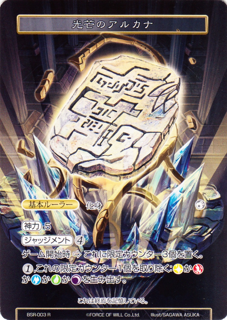 ![]() ![]() | BSR-003 光芒のアルカナ 基本ルーラー 新生ヴァルハラクラスタ 基本ルーラーセット R 属性:無 タイプ:化身 【神力】5 【ジャッジメント】④ ゲーム開始時⇒これに限定カウンター3個を置く。 ①,これの限定カウンター1個を取り除く:(光)か(炎)か(水)か(風)か(闇)を生み出す。 両面:光芒の巨人 これは終焉を記憶している。 illust:SAGAWA ASUKA |