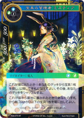 ![]() ![]() | RDE-074 宝具の管理者 ミスティア リゾネイター ラピスクラスタ 第3弾 ブースターパック 聖魔大戦 SR 属性:水/風 タイプ:兎人 コスト:(水)(風)(1) ATK:500 DEF:500 これが場に出たとき⇒あなたのデッキから宝具1枚を探し、公開して手札に加えてよい。その後、あなたのデッキをシャッフルする。 これが場から墓地に置かれたとき⇒あなたの手札から総コストが3以下の宝具1枚を場に出してよい。 「宝具が一つ、宝具が二つ、と。お待たせ致しました。何かご入用ですか?かぐや様」 illust:ShiroYayoi |