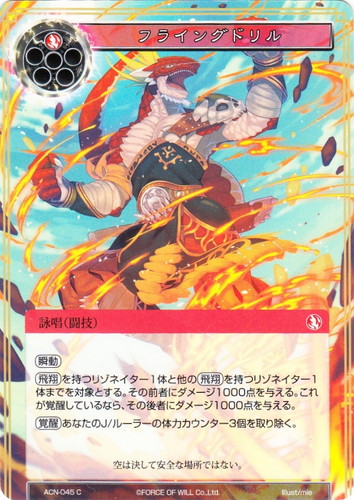 ![]() ![]() | ACN-045 フライングドリル 詠唱 零夜クラスタ 第1弾 ブースターパック 革命前夜 C 属性:炎 タイプ:闘技 コスト:(炎) 【瞬動】 【飛翔】を持つリゾネイター1体と他の【飛翔】を持つリゾネイター1体までを対象とする。その前者にダメージ1000点を与える。これが覚醒しているなら、その後者にダメージ1000点を与える。 【覚醒】あなたのJ/ルーラーの体力カウンター3個を取り除く。 空は決して安全な場所ではない。 illust:mie |