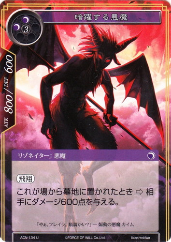 ![]() ![]() | ACN-134 暗躍する悪魔 リゾネイター 零夜クラスタ 第1弾 ブースターパック 革命前夜 U 属性:闇 タイプ:悪魔 コスト:(闇)(闇)(3) ATK:800 DEF:600 【飛翔】 これが場から墓地に置かれたとき⇒相手にダメージ600点を与える。 「やあ、フレイラ。順調かい?」―煽動の悪魔 カイム illust:tokiwa |