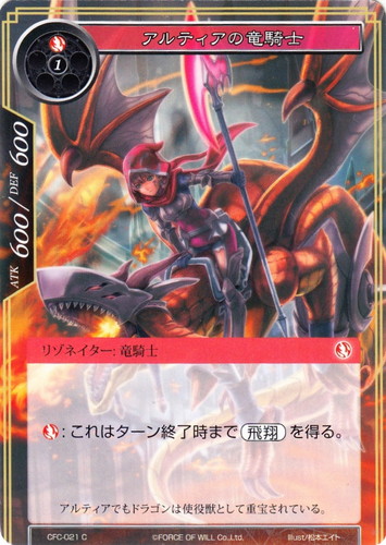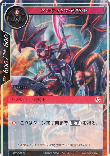 ![]() ![]() | CFC-021 アルティアの竜騎士 リゾネイター ラピスクラスタ 第1弾 ブースターパック 氷棺の聖女 C(foil) 属性:炎 タイプ:竜騎士 コスト:(炎)(1) ATK:600 DEF:600 (炎):これはターン終了時まで【飛翔】を得る。 アルティアでもドラゴンは使役獣として重宝されている。 illust:松本エイト |