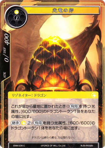 ![]() ![]() | ENW-006 光竜の卵 リゾネイター ラピスクラスタ 第4弾 ブースターパック 新世界童話 リ・アース C 属性:光 タイプ:ドラゴン コスト:(光)(1) ATK:0 DEF:400 これが場から墓地に置かれたとき⇒【飛翔】を持つ光属性、[600/600]のドラゴントークン1体をあなたの場に出す。 【継承】(光)(2):【飛翔】を持つ光属性、[600/600]のドラゴントークン1体をあなたの場に出す。 ドラゴンは卵から孵る、とは限らない。 illust:Moopic |