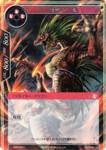![]() ![]() | ENW-032 侵略の小竜 リゾネイター ラピスクラスタ 第4弾 ブースターパック 新世界童話 リ・アース C(foil) 属性:炎 タイプ:ドラゴン コスト:(炎)(炎)(炎) ATK:800 DEF:800 【飛翔】 バハムートが従える、小さくとも鋭い刃。 illust:SO |