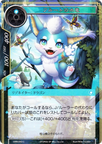 ![]() ![]() | ENW-043 フルートの水竜 リゾネイター ラピスクラスタ 第4弾 ブースターパック 新世界童話 リ・アース C 属性:水 タイプ:ドラゴン コスト:(水) ATK:100 DEF:400 あなたがコールするなら、J/ルーラーの代わりにリカバー状態のこれをレストしてコールしてよい。 【封印】(5)―これは[+400/+400]と【飛翔】を得る。 時は機会そのものだ。 illust:Misa Tsutsui |