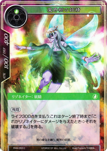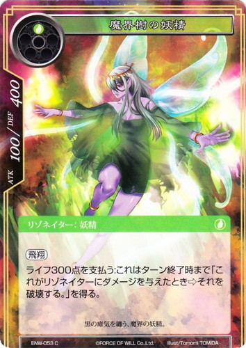 ![]() ![]() | ENW-053 魔界樹の妖精 リゾネイター ラピスクラスタ 第4弾 ブースターパック 新世界童話 リ・アース C 属性:風 タイプ:妖精 コスト:(風) ATK:100 DEF:400 【飛翔】 ライフ300点を支払う:これはターン終了時まで「これがリゾネイターにダメージを与えたとき⇒それを破壊する。」を得る。 黒の瘴気を纏う、魔界の妖精。 illust:Tomomi TOMIDA |