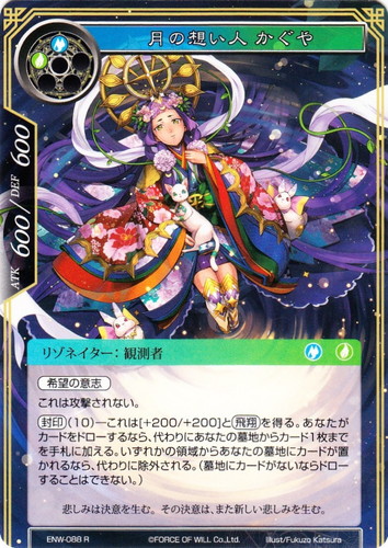 ![]() ![]() | ENW-088 月の想い人 かぐや リゾネイター ラピスクラスタ 第4弾 ブースターパック 新世界童話 リ・アース R 属性:水/風 タイプ:観測者 コスト:(水)(風) ATK:600 DEF:600 【希望の意志】 これは攻撃されない。 【封印】(10)―これは[+200/+200]と【飛翔】を得る。あなたがカードをドローするなら、代わりにあなたの墓地からカード1枚までを手札に加える。いずれかの領域からあなたの墓地にカードが置かれるなら、代わりに除外される。(墓地にカードがないならドローすることはできない。) 悲しみは決意を生む。その決意は、また新しい悲しみを生む。 illust:Fukuzo Katsura |