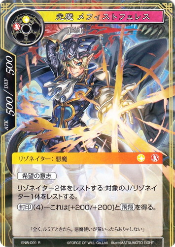 ![]() ![]() | ENW-091 光魔 メフィストフェレス リゾネイター ラピスクラスタ 第4弾 ブースターパック 新世界童話 リ・アース R 属性:光/炎 タイプ:悪魔 コスト:(光)(炎) ATK:500 DEF:500 【希望の意志】 リゾネイター2体をレストする:対象のJ/リゾネイター1体をレストする。 【封印】(4)―これは[+200/+200]と【飛翔】を得る。 「全く、ルミアときたら。悪魔使いが荒いったらありゃしない」 illust:MATSUMOTO EIGHT |