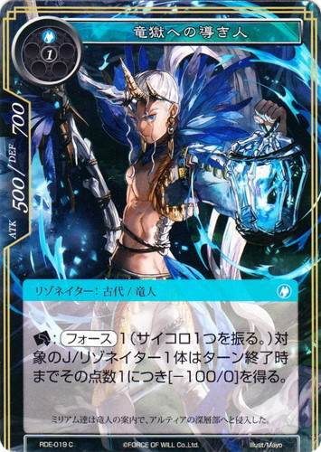 ![]() ![]() | RDE-019 竜獄への導き人 リゾネイター ラピスクラスタ 第3弾 ブースターパック 聖魔大戦 C(foil) 属性:水 タイプ:古代/竜人 コスト:(水)(1) ATK:500 DEF:700 [レスト]:【フォース】1(サイコロ1つを振る。)対象のJ/リゾネイター1体はターン終了時までその点数につき[-100/0]を得る。 ミリアム達は竜人の案内で、アルティアの深層部へと侵入した。 illust:Mayo |