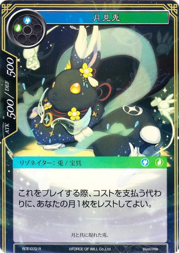 ![]() ![]() | RDE-072 月見兎 リゾネイター ラピスクラスタ 第3弾 ブースターパック 聖魔大戦 R 属性:水/風 タイプ:兎/宝具 コスト:(水)(風) ATK:500 DEF:500 これをプレイする際、コストを支払う代わりに、あなたの月1枚をレストしてよい。 月と共に現れた兎。 illust:mie |