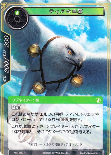![]() ![]() | ACN-109 ティアの白鷹 リゾネイター 零夜クラスタ 第1弾 ブースターパック 革命前夜 R 属性:風 タイプ:獣 コスト:(風) ATK:200 DEF:200 【飛翔】 これはあなたが”エルフの弓姫 ティア・レトリエラ”をコントロールしているなら【迅速】を得る。 これが攻撃したとき⇒プレイヤー1人かリゾネイター1体を対象とし、それにダメージ200点を与える。 「来て!」―エルフの弓姫 ティア・レトリエラ illust:kakotomirai |
