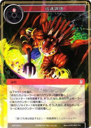 ![]() ![]() | ADK-040 迅速調理 詠唱 零夜クラスタ 第2弾 ブースターパック 魔王降臨 C 属性:炎 コスト:(炎) 以下から1つを選ぶ。 「あなたのJ/ルーラーに体力カウンター5個を置く。」 「リゾネイター1体を破棄する。そうしたなら、あなたのJ/ルーラーに体力カウンター10個を置く。」 「獣のリゾネイター1体を破棄する。そうしたなら、あなたのJ/ルーラーに体力カウンター15個を置く。」 「速くても味は保証するよ!」―特級調理人 シェリー・シェラー illust:KEIICHIRO ITO |