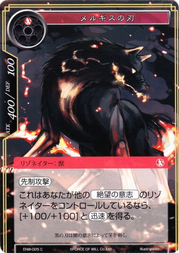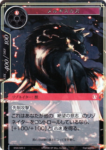 ![]() ![]() | ENW-025 メルギスの刃 リゾネイター ラピスクラスタ 第4弾 ブースターパック 新世界童話 リ・アース C(foil) 属性:炎 タイプ:獣 コスト:(炎) ATK:400 DEF:100 【先制攻撃】 これはあなたが他の【絶望の意志】のリゾネイターをコントロールしているなら、[+100/+100]と【迅速】を得る。 黒の刃は闇の意志によって牙を剥く。 illust:gekko |