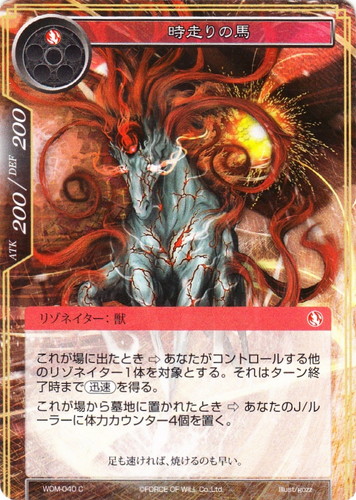 ![]() ![]() | WOM-040 時走りの馬 リゾネイター 零夜クラスタ 第4弾 ブースターパック 十六夜の風 C 属性:炎 タイプ:獣 コスト:(炎) ATK:200 DEF:200 これが場に出たとき⇒あなたがコントロールする他のリゾネイター1体を対象とする。それはターン終了時まで【迅速】を得る。 これが場から墓地に置かれた時⇒あなたのJ/ルーラーに体力カウンター4個を置く。 足も速ければ、焼けるのも早い。 illust:gozz |