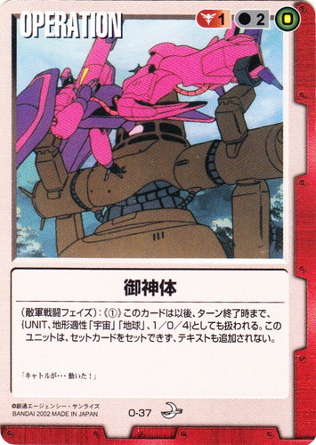 ![]() ![]() | O-37 御神体 OPERATION 月下の戦塵 色:赤 コスト[指定/合計(資源)]:赤1/2(0) (敵軍戦闘フェイズ):《①》このカードは以後、ターン終了時まで、{UNIT、地形適正「宇宙」「[type:地球]]、1/0/4}としても扱われる。このユニットは、セットカードをセットできず、テキストも追加されない。 「キャトルが・・・動いた!」 |