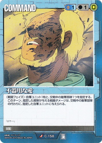 ![]() ![]() | C-158 不器用な愛 COMMAND ドラマチックブースター 乱世に生きる漢たち U 色:青 コスト[指定/合計(資源)]:青1/1(0) 特徴:支配 (戦闘フェイズ):自軍ユニット1枚と、交戦中の敵軍部隊1つを指定する。このターン、指定した部隊が与える戦闘ダメージは、交戦中の敵軍部隊の代わりに、指定した自軍ユニットに与えられる。 「エマ・・・」 |