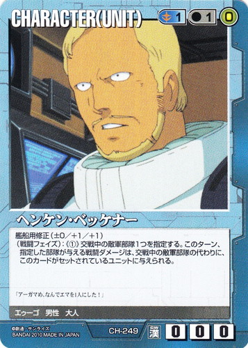 ![]() ![]() | CH-249 ヘンケン・ベッケナー CHARACTER ドラマチックブースター 乱世に生きる漢たち 色:青 セット対象:UNIT コスト[指定/合計(資源)]:青1/1(0) 格闘力:0 射撃力:0 防御力:0 特徴:エゥーゴ/男性/大人 艦船用修正(±0/+1/+1) (戦闘フェイズ):《①》交戦中の敵軍部隊1つを指定する。このターン、指定した部隊が与える戦闘ダメージは、交戦中の敵軍部隊の代わりに、このカードがセットされているユニットに与えられる。 「アーガマめ、なんでエマを1人にした!」 |